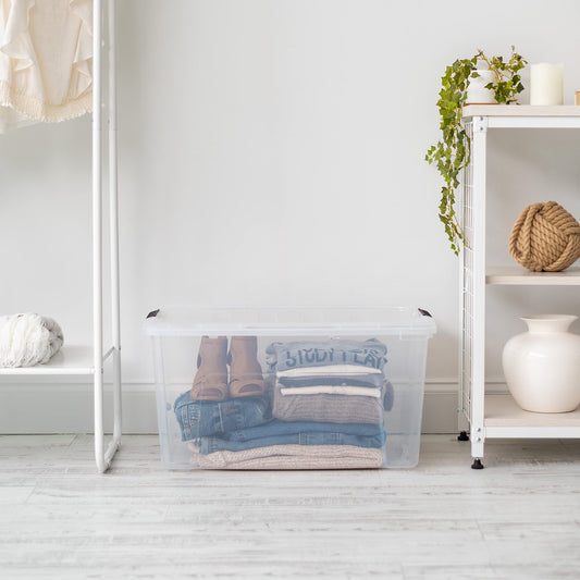 IRIS USA 72 QT Plastic Storage Box with Lid and Latches - 4 Pack - BPA-Free, See-Through Organizing Solution, Durable Nestable Stackable Containers, Secure Pull Handle - Clear