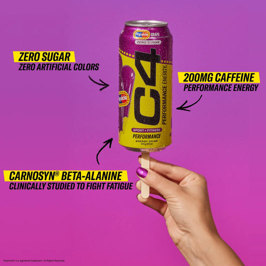 C4 Energy Drink x Grape Popsicle, Carbonated Sugar Free Pre Workout Performance Drink with no Artificial Colors or Dyes, 16 Oz, Pack of 12