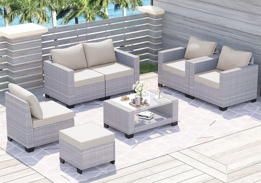 7 Piece Outdoor Patio Furniture Set, Outdoor Sectional Furniture, Rattan Chairs Glass Table Wicker Conversation Seating Sectional Sofa with Cushions (B-Grey White-Grey, B-7 Pieces-Tilted Back)