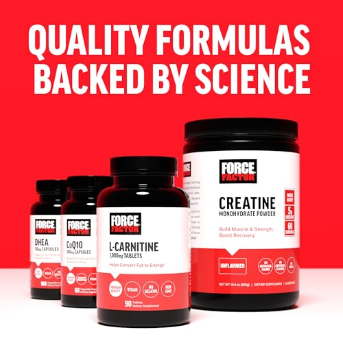 FORCE FACTOR Creatine Monohydrate, Creatine Powder for Muscle Gain, More Strength, and Faster Workout Recovery, Clinically Studied Micronized Creatine 5g Dose Per Serving, Unflavored, 60 Servings