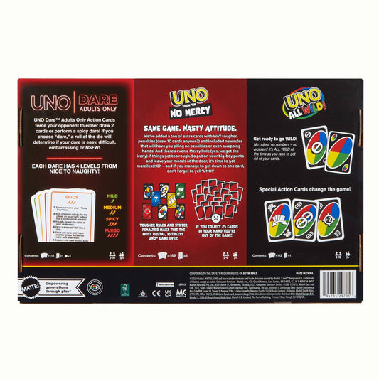 UNO All Wild, UNO Show ‘em No Mercy, UNO Dare Adults Only 3 Card Game Bundle