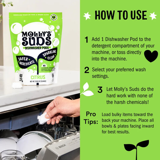 Molly's Suds Dishwasher Pods | Natural Dishwasher Detergent, Cuts Grease & Rinses Clean (Residue-Free) for Sparkling Dishes | 120 Auto-Release Tabs (Citrus)