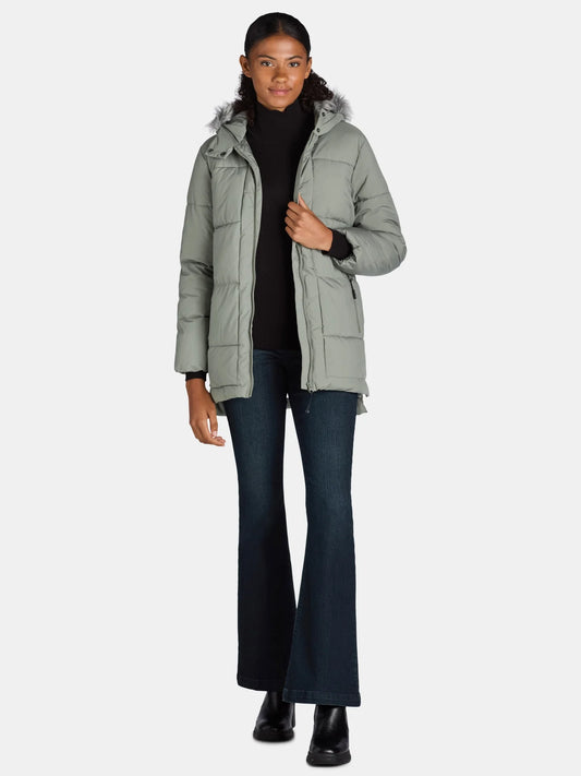 Big Chill Women's and Women's Plus Wide Quilted Puffer Coat with Faux Fur Trim Hood, Sizes S-3X
