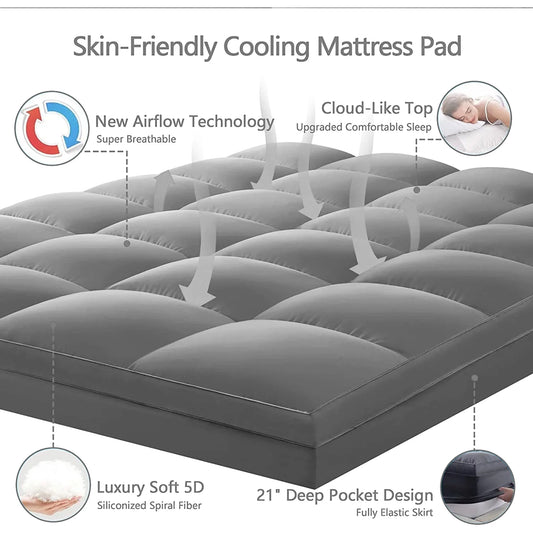 INGALIK Full XL Mattress Topper, Extra Thick Cooling Mattress Pad Cover, 400TC Cotton Pillow Top Protector with 8-21" Deep Pocket, Soft 5D Spiral Fiber Padding for Back Pain, Light Grey