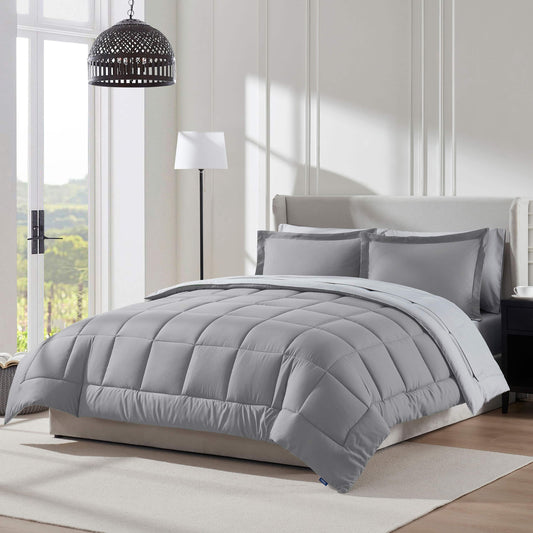 Virtu Queen Comforter Set, 7pc Bed in a Bag, Reversible Bedding Comforter Sets with Sheets, Gray/Silver