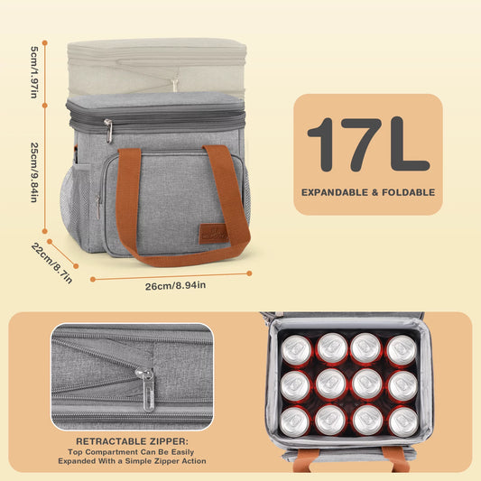 Insulated Lunch Bag, 17L Expandable Double Deck Lunch Tote Bag for Women/Men, Leakproof Freezable Cooler Box W/ Side Tissue Pocket&Adjustable Shoulder Strap, Suit for Work,School,Camping,Picnic(Gray)