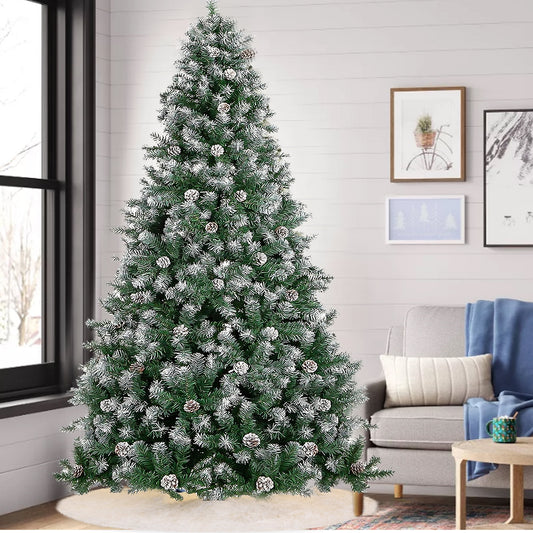 Yexmas 6ft Pre-Lit Realistic Artificial Christmas Trees,Green Christmas Trees with 1200 Flocked Frosted Tips & 80 Pine Cones,LED Lights Christmas Trees with 48 Inch Christmas Tree Skirt White