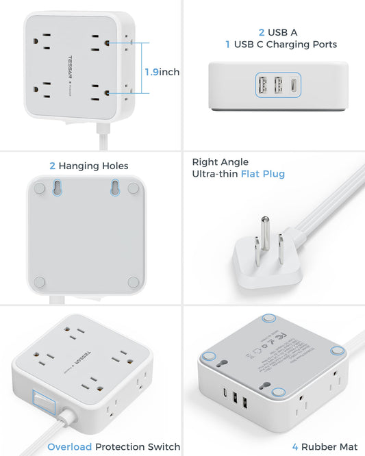 Surge Protector Flat Extension Cord Flat Plug Power Strip, 8 AC Outlets, 3 USB Charger(1 USB C Port) 3-Sided Outlet Extender, 5 Ft, 900 Joules Protection, Office Supplies, Dorm Room Essentials, Grey