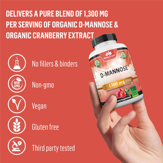 NaturaLife Labs A Higher Standard Organic D-Mannose 1,300 mg with Cranberry Extract Fast-Acting, Flush Impurities, Urinary Tract Health- 100 Veggie Capsules