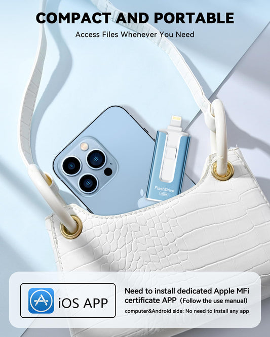 MFi Certified 256GB Flash Drive for iPhone iPad, Photo Stick for External Memory Storage, Easily Back Up and Save Photos Videos, USB Memory Stick Thumb Drive for iPhone/iPad/Android/PC (Blue, 256GB)