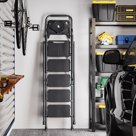 KINGRACK Folding 5 Step Ladder, Portable Ladder for Multi-Purpose, Home, Kitchen, Heavy Sturdy Steel Step Stool with Anti-Slip Wide Pedals, Handrail, Safe-Lock Design, Pass 500lbs Load Testing, Black