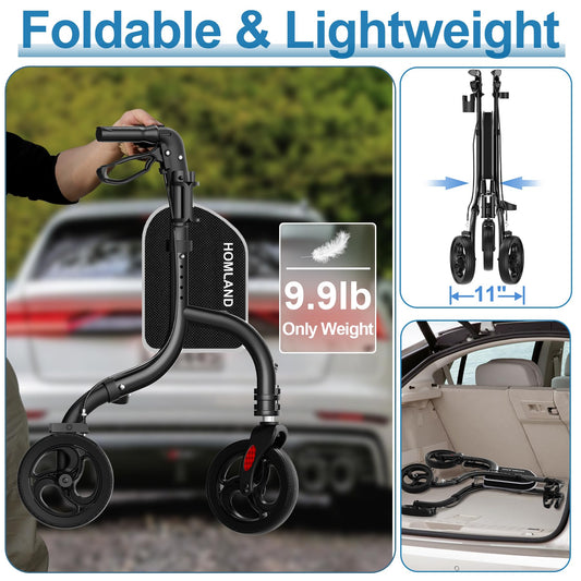 HOMLAND 3 Wheel Walkers for Seniors, FSA/HSA Eligible Foldable Wheeled Rollator with Cane Hold and Cup Hold, Lightweight Three Wheel Rolling Walker Height Adjustable for Seniors