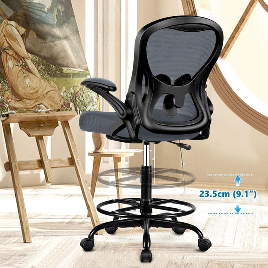 Winrise Drafting Chair, Tall Office Chair Ergonomic Standing Desk Chair, Lumbar Support Computer Chair Swivel Task Rolling Chair with Adjustable Flip-up Armrests & Foot Ring (Dark Gray)