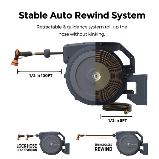 Giraffe Tools AW30 1/2MB Retractable Garden Hose Reel 1/2" x 100 ft PRO Metal Bracket, Heavy Duty, Any Length Lock Hose Reel, 100 ft, Dark Grey