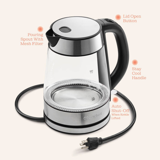 Speed-Boil Electric Kettle For Coffee & Tea - 1.7L Water Boiler 1500W, Borosilicate Glass, Easy Clean Wide Opening, Auto Shut-Off, Cool Touch Handle, LED Light. 360° Rotation, Boil Dry Protection