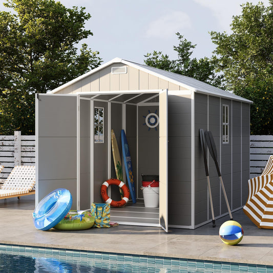 UDPATIO Storage Shed 8 x 10 FT, Resin Outdoor Garden Sheds with Floor Plastic Patio Outdoor Storage with Lockable Door for Tool, Bike, Garbage Gray White
