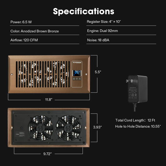 VIVOSUN Quiet Register Booster Fan 4”×10”, Smart Register Vent with Intelligent Thermostat Control, Cooling Heating AC Vent Booster Fan, Brown
