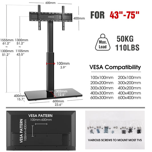 AOKCOS Swivel TV Floor Stand for 43-75 Inches TVs, 8 Level Height Adjustable Corner Extra Tall TV Stand Mount for Living Room/Bedroom, Holds up to 110 lbs,MAX VESA 600x400mm,Black