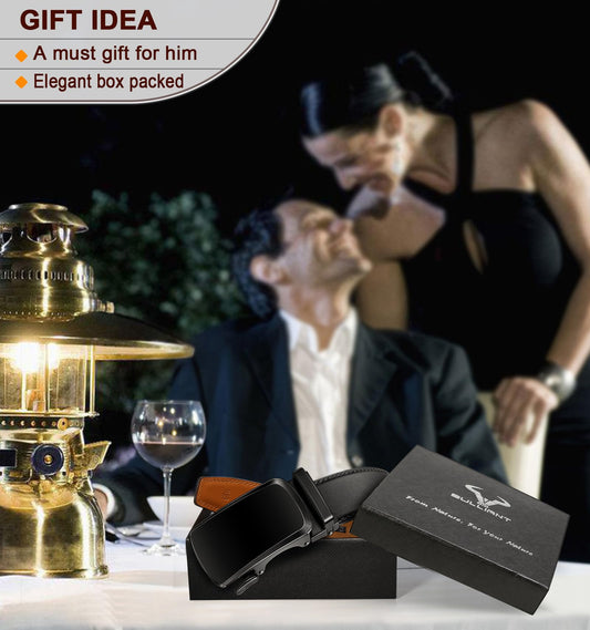 BULLIANT Men's Ratchet Belt 2 Pack-Click Leather Belt Adjustable for Men Gift 1 3/8-Cut for Perfect Fit(Black/Light Brown,32"-38" Waist Adjustable)
