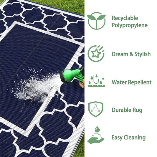 GENIMO 6' x 9' Outdoor Rug Waterproof for Patio Decor, Foldable Reversible Plastic Straw Area Rugs Mat for Camper, Outside Carpet for Rv, Deck, Porch, Picnic, Beach, Balcony, Blue & Grey