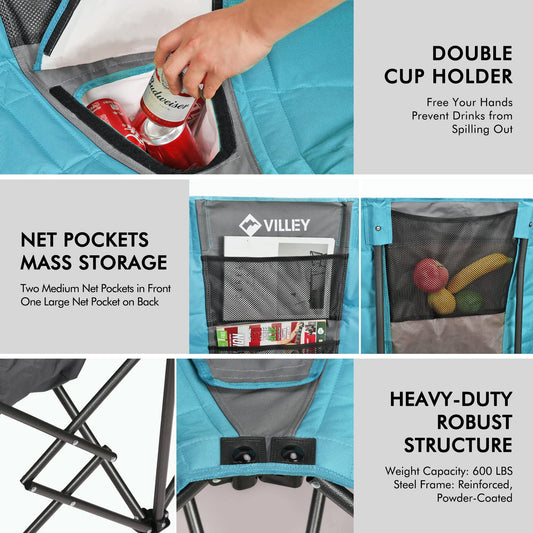 VILLEY Double Camping Chair w/Cooler Bag, Extra Wide Loveseat, Heavy Duty Padded Camping Couch, Portable Folding Chair w/Carry Bag Steel Frame Cup Holders for Camp Lawn Picnic Sports, Support 600LBS