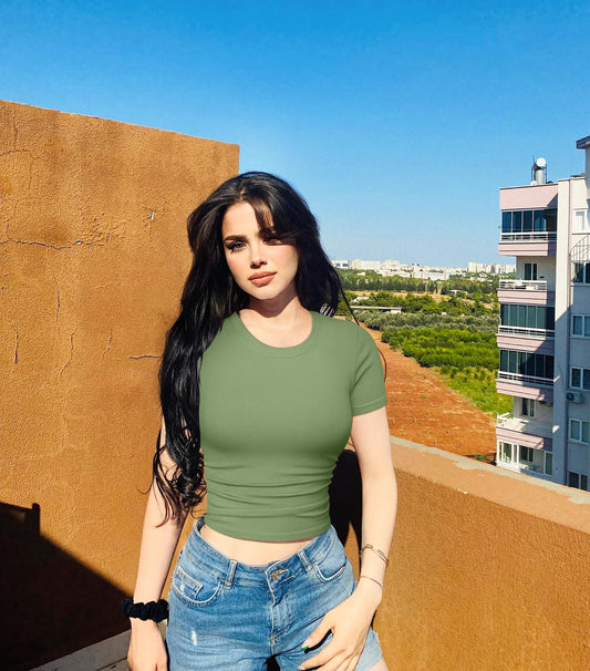 OQQ Womens 2 Piece Shirts Short Sleeve Crew Neck Ruched Stretch Fitted Tee Shirts Crop Tops Pea Green Beige