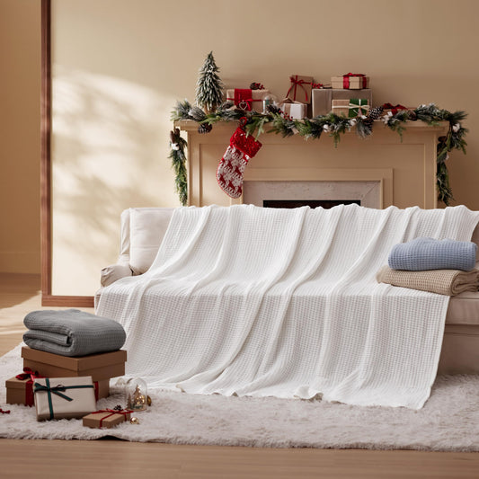 Bedsure 100% Cotton Blanket Queen Size for Bed - Breathable and Soft, Waffle Weave Blanket for Summer Spring, White, 90x90 Inches