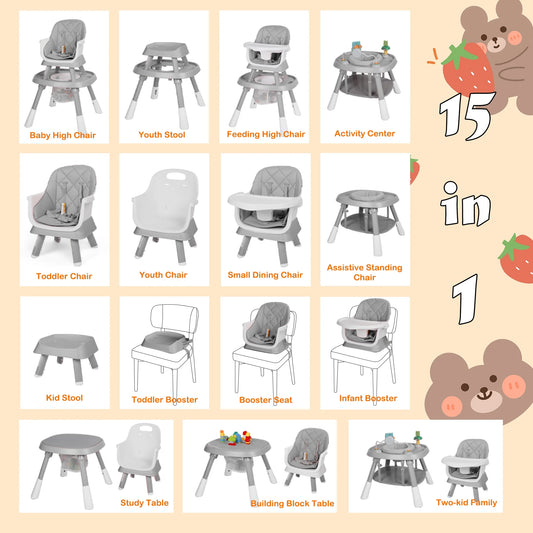 AILEEKISS 15 in 1 Baby High Chair, Toddler Dining Booster Seat w/Activity Center, Grey