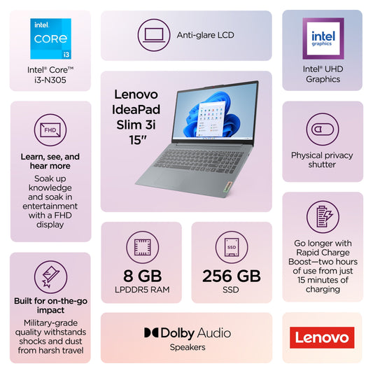 Lenovo IdeaPad Slim 3i 15.6 inch Laptop Intel Core i3-N305 8GB RAM 256GB SSD Arctic Grey