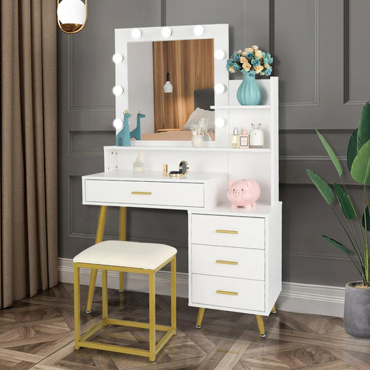 Ktaxon Vanity Table Set with Lighted Mirror, Makeup Table with 4 Drawers, Dressing Vanity Tables, Dresser Desk for Girls, Women, White