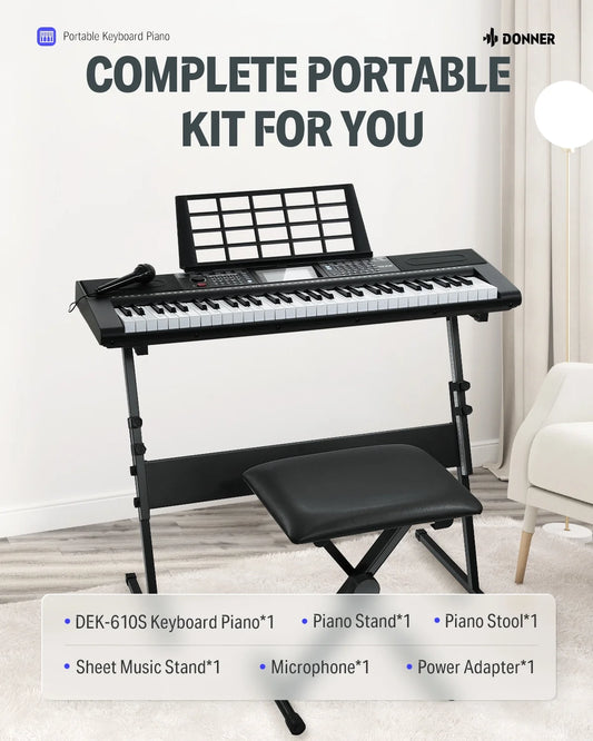 Donner Upgraded 61 Key Piano Keyboard, Electric Keyboard Kit with 249 Voices, 249 Rhythms - Includes Piano Stand, Stool, Microphone, Gift for Beginners, Black (DEK-610S)