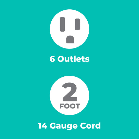KMC 6-Outlet Power Strip, 2-Pack, 2-Foot Short Extension Cord with Multiple Outlets, 6 AC Power Outlet Power Bar, 2pk Power Strips, Black