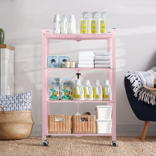 COOKCOK 4-Tier Storage Shelving Unit, Metal Shelf, Foldable Storage Shelf with Wheels, 27.9"x13.4"x49.72" Garage Shelf, Kitchen Shelf with 4 Hooks, No Assemble Require, Pink