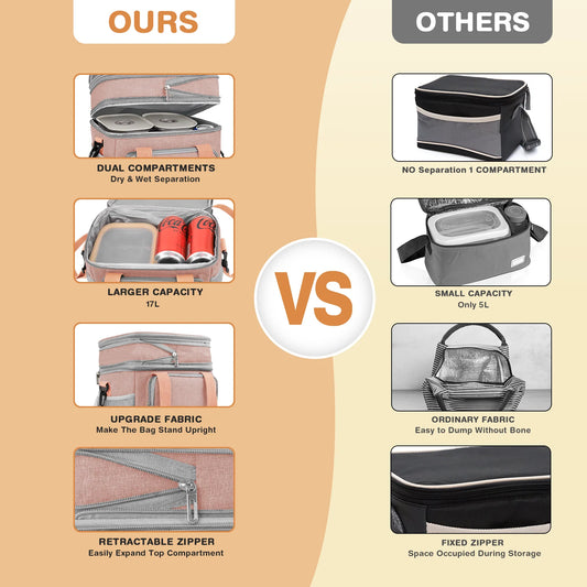 Lunch Bags for Women Men, 17L Reusable Insulated Lunch Bag, Double Deck Lunch Tote Box for Office Work School Picnic Beach, Leakproof Cooler Bag with Adjustable Strap/Side Mesh Pocket, Pink