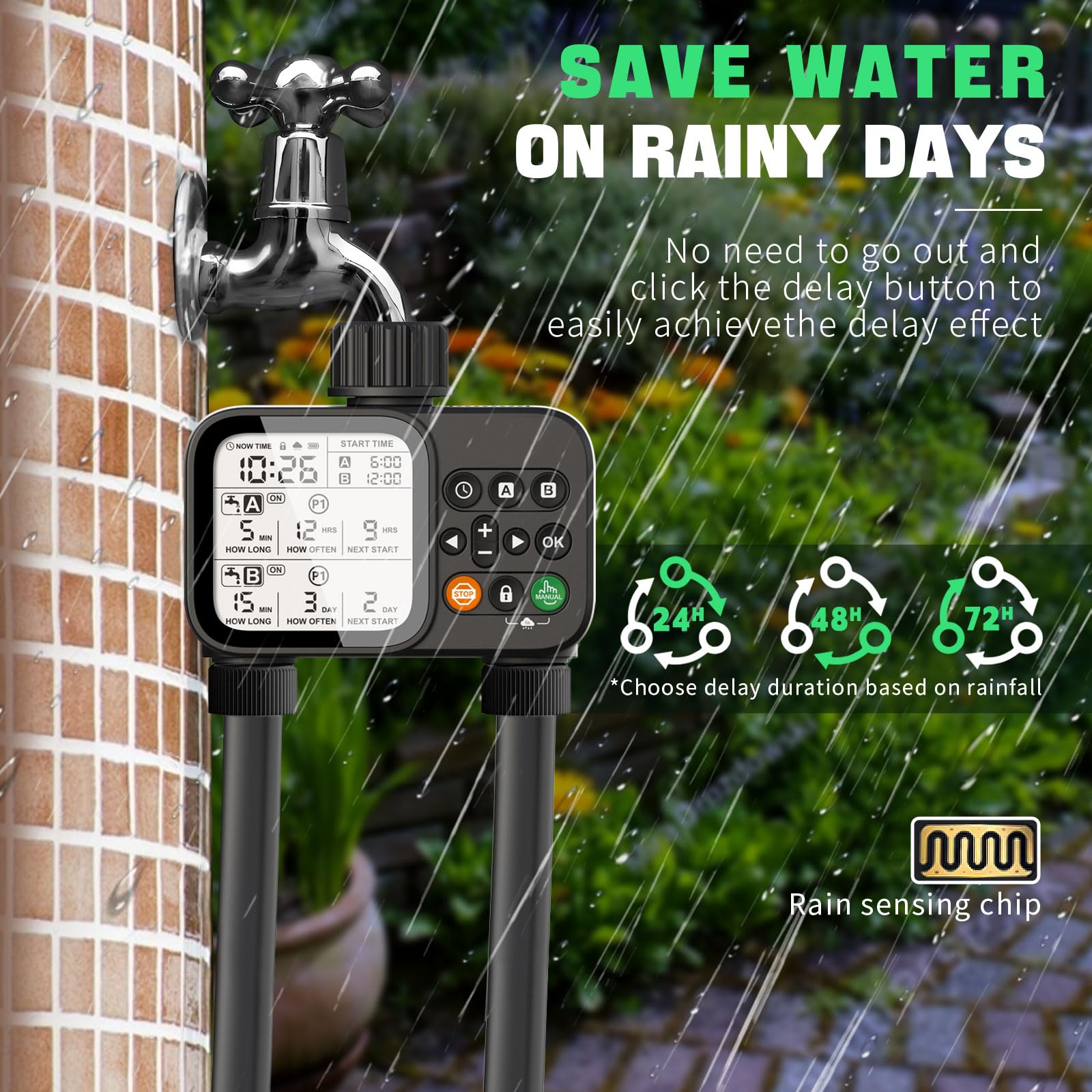 2 Zone Sprinkler Timer, Smart Programmable Hose Water Timer with Auto Rain Delay, 5 Separate Program, 3.3โ€œ Large LCD Display Digital Irrigation for Plant, Yard, Lawns, Outdoor