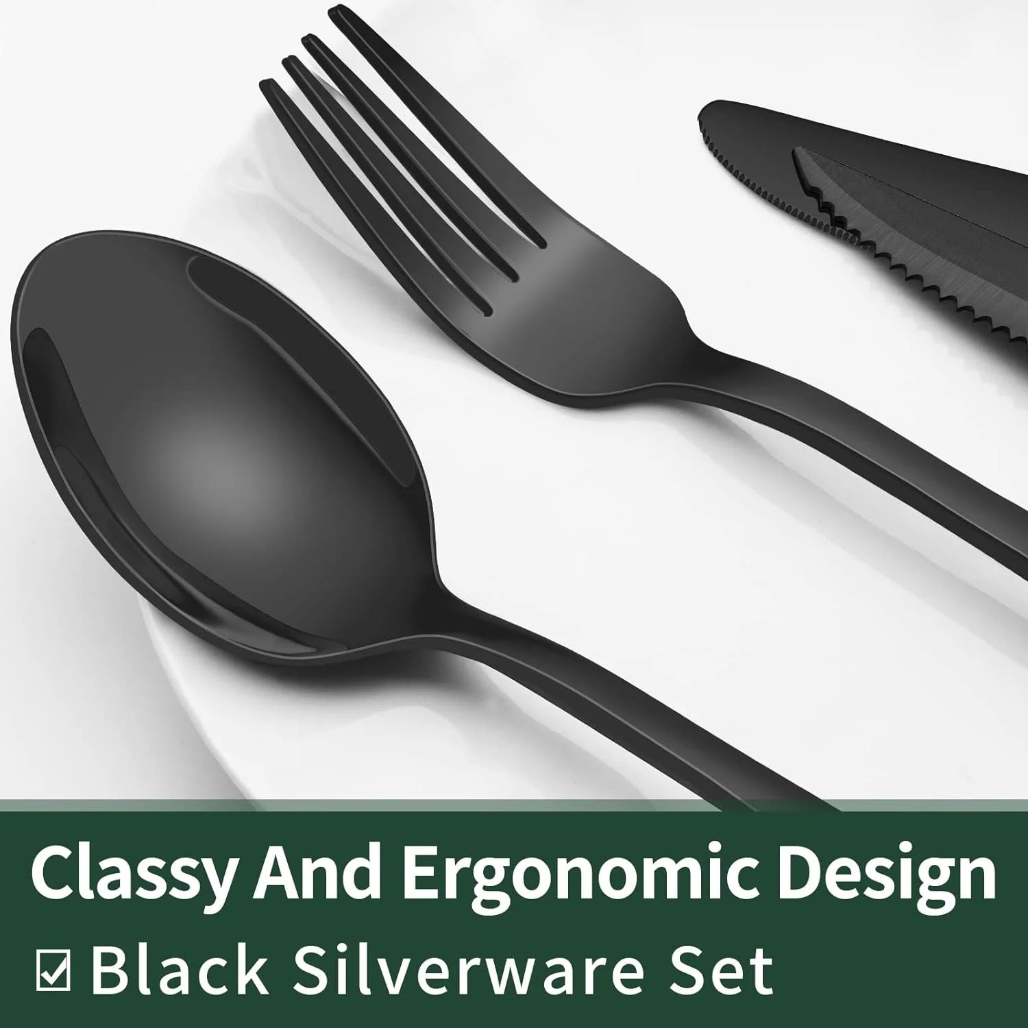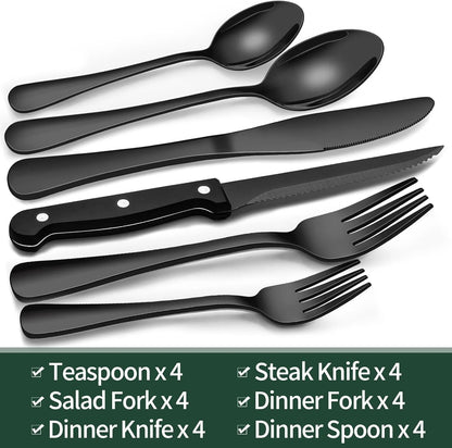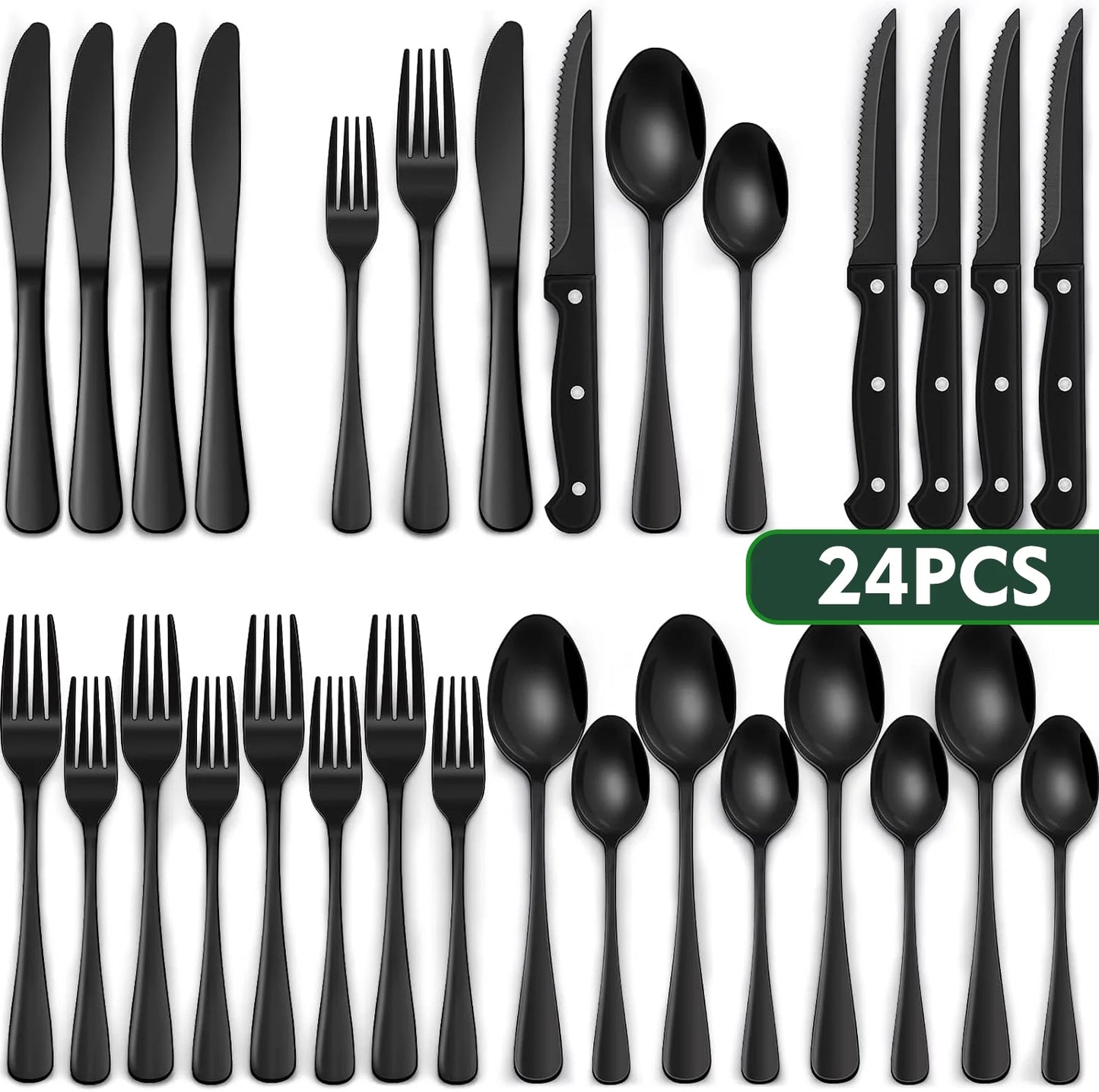 24-Piece Black Silverware Set with Steak Knives, Black Flatware Set for 4, Food-Grade Stainless Steel Tableware Cutlery Set, Mirror Finished Utensil Sets for Home Restaurant