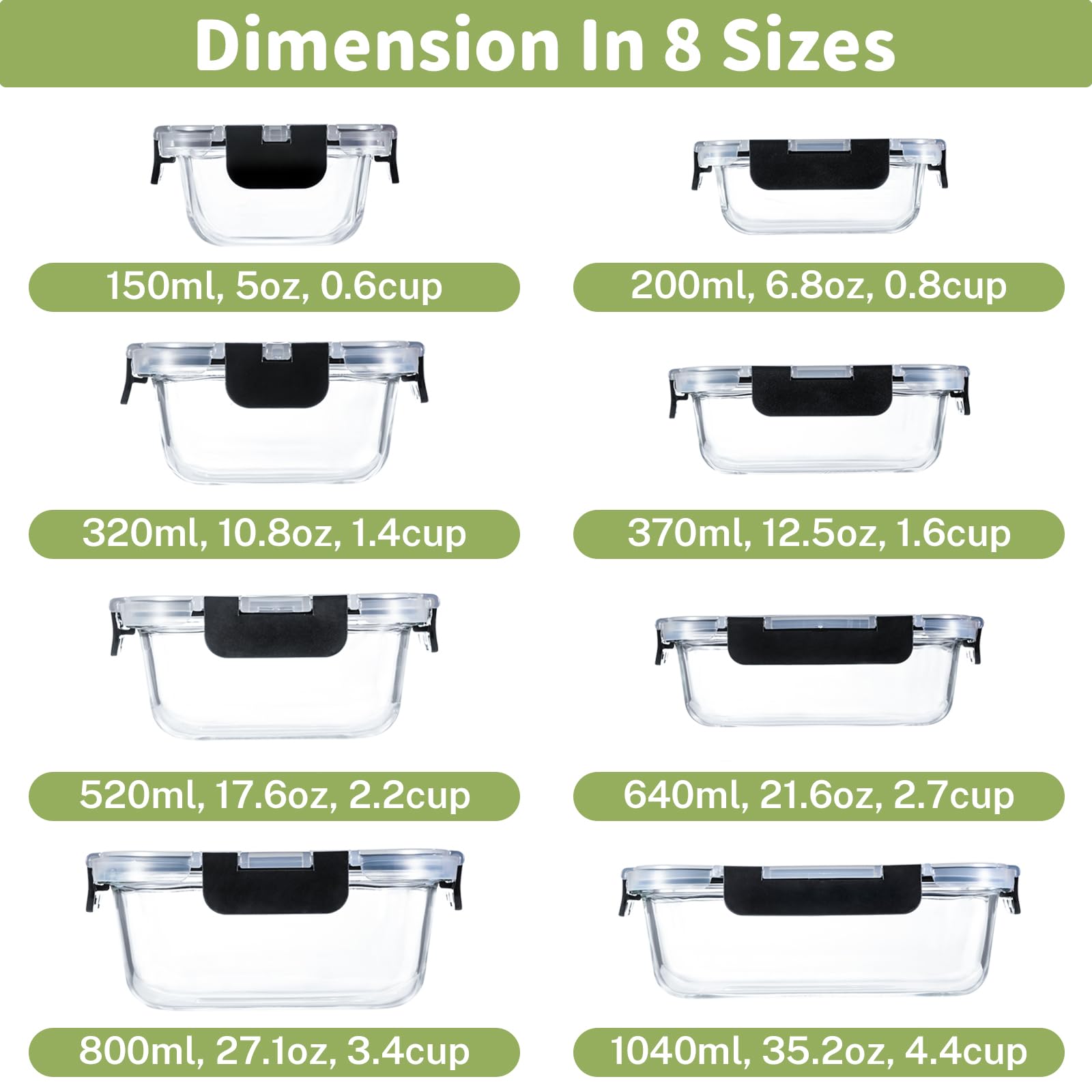8 Pack Borosilicate Glass Food Storage Containers with Lids, Glass Meal Prep Containers, Airtight Bento Lunch Boxes with Leak Proof Locking, Oven, Freezer and Dishwasher Safe, BPA Free, 5-35oz
