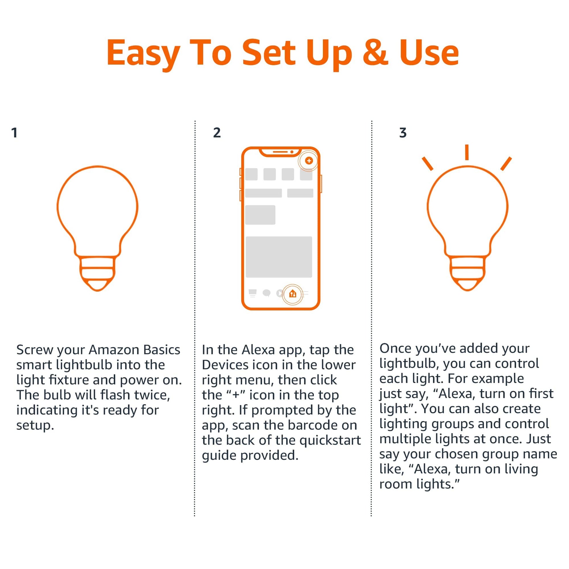 Amazon Basics Smart A19 LED Light Bulb, Color Changing, 9W (60W Equivalent), 800LM, Works with Alexa Only, 2.4 GHz Wi-Fi, No Hub Required, 1 Pack