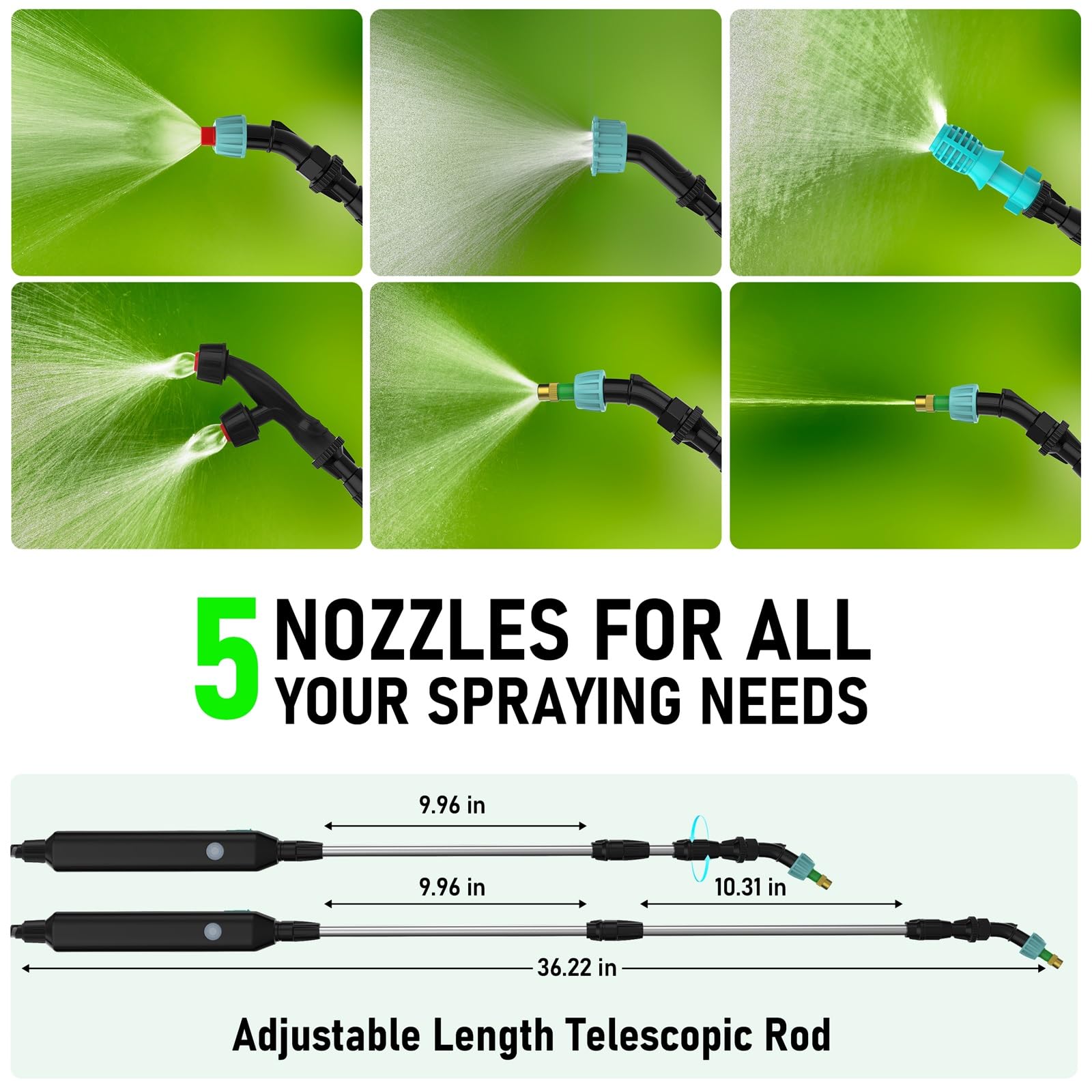 Battery Powered Garden Sprayer 2 Gallon, Electric Backpack Sprayer, Weed Yard Lawn Sprayer with 5 Mist Nozzles & Retractable Wand & Adjustable Strap for Lawn, Garden, Yard