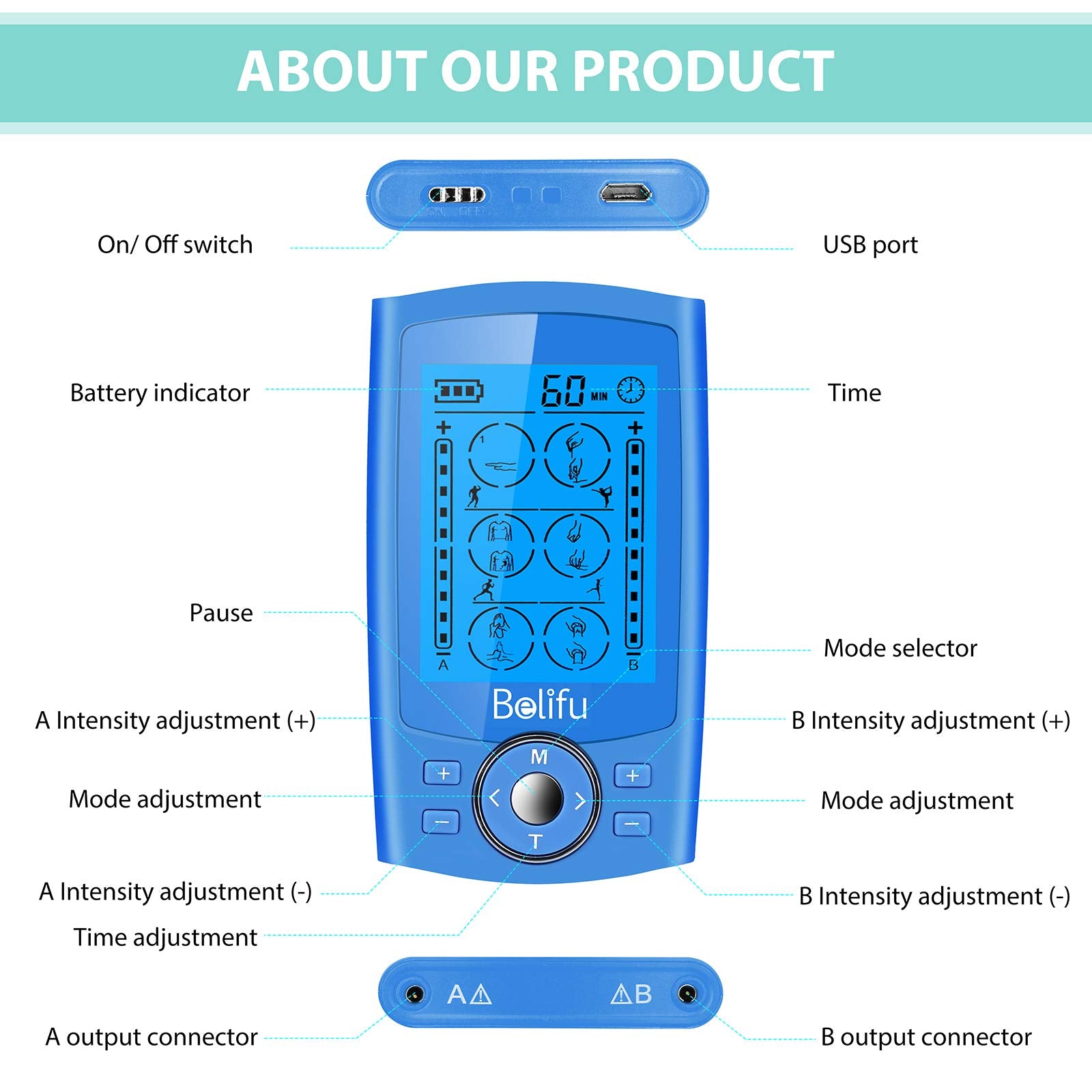 Belifu Dual Channel TENS EMS Unit 24 Modes Muscle Stimulator for Pain Relief Therapy, Electronic Pulse Massager Muscle Massager with 10 Pads, Dust-Proof Drawstring Storage Bag, Fastening Cable Ties