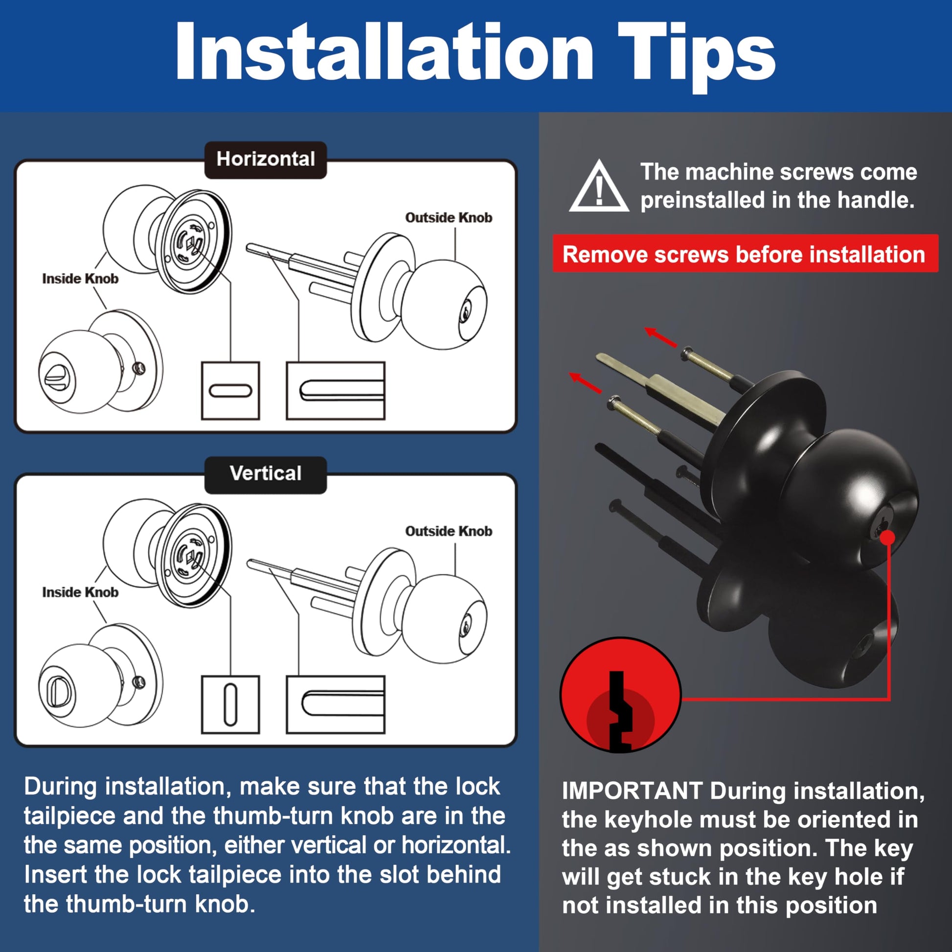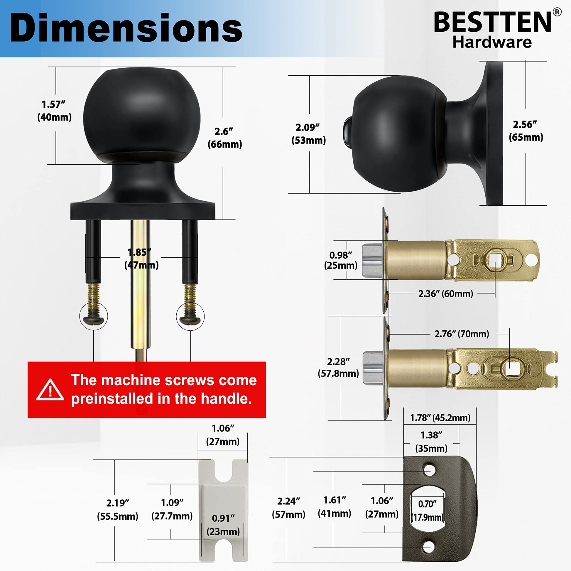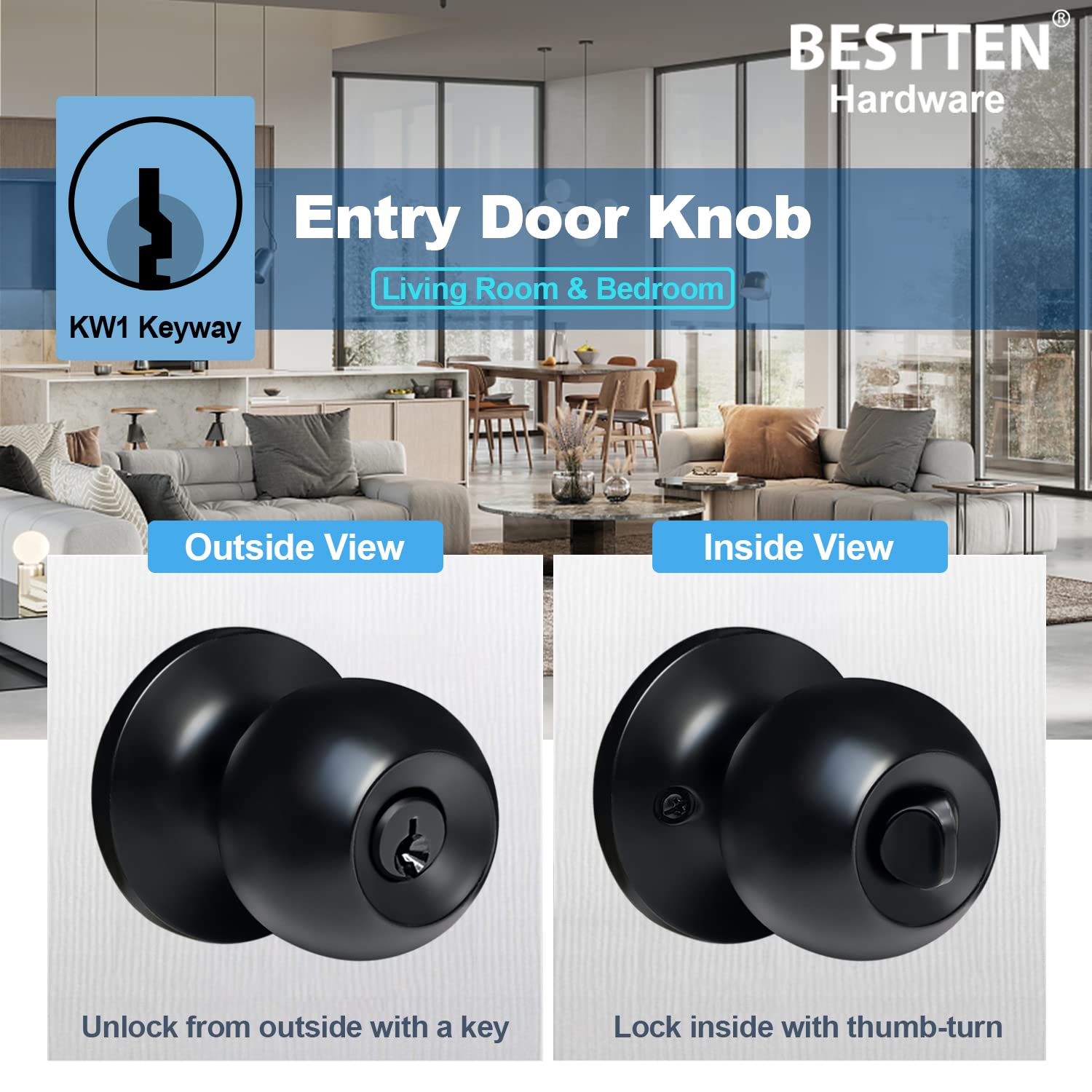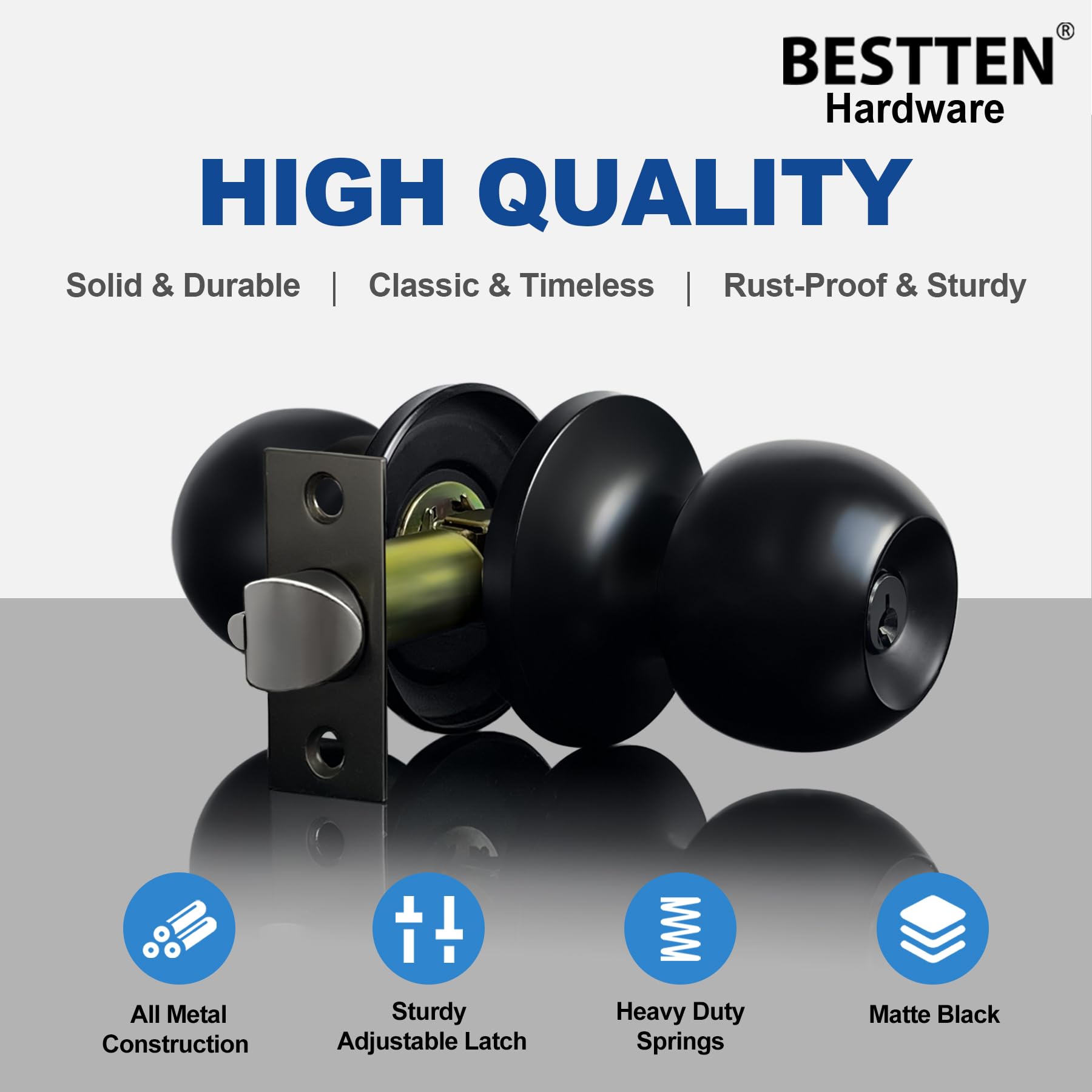 BESTTEN Keyed Entry Door Knob, Entrance Door Lock, Standard Ball, All Metal, Matte Black