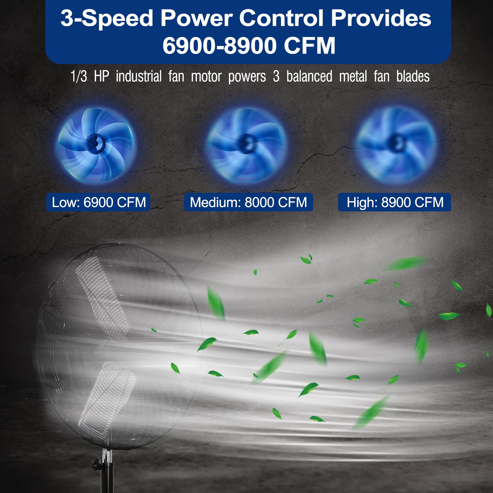 BILT HARD 8900 CFM 30" High-Velocity Industrial Pedestal Fan, 3-Speed Heavy Duty Industrial Standing Fan with Metal Aluminum Blades and Adjustable Height, Idea for Commercial, Shop, and Garage