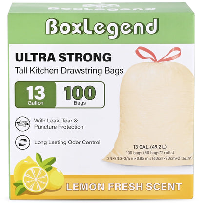 BoxLegend Trash Bags, Ultra Strong 13 Gallon Drawstring Tall Kitchen Garbage Bags, Lemon Scent, 100 Pcs, Light Yellow