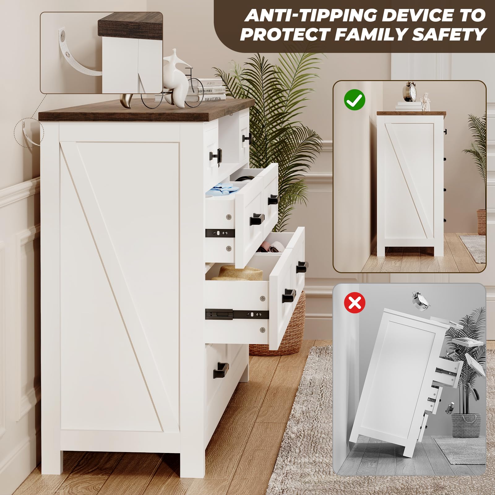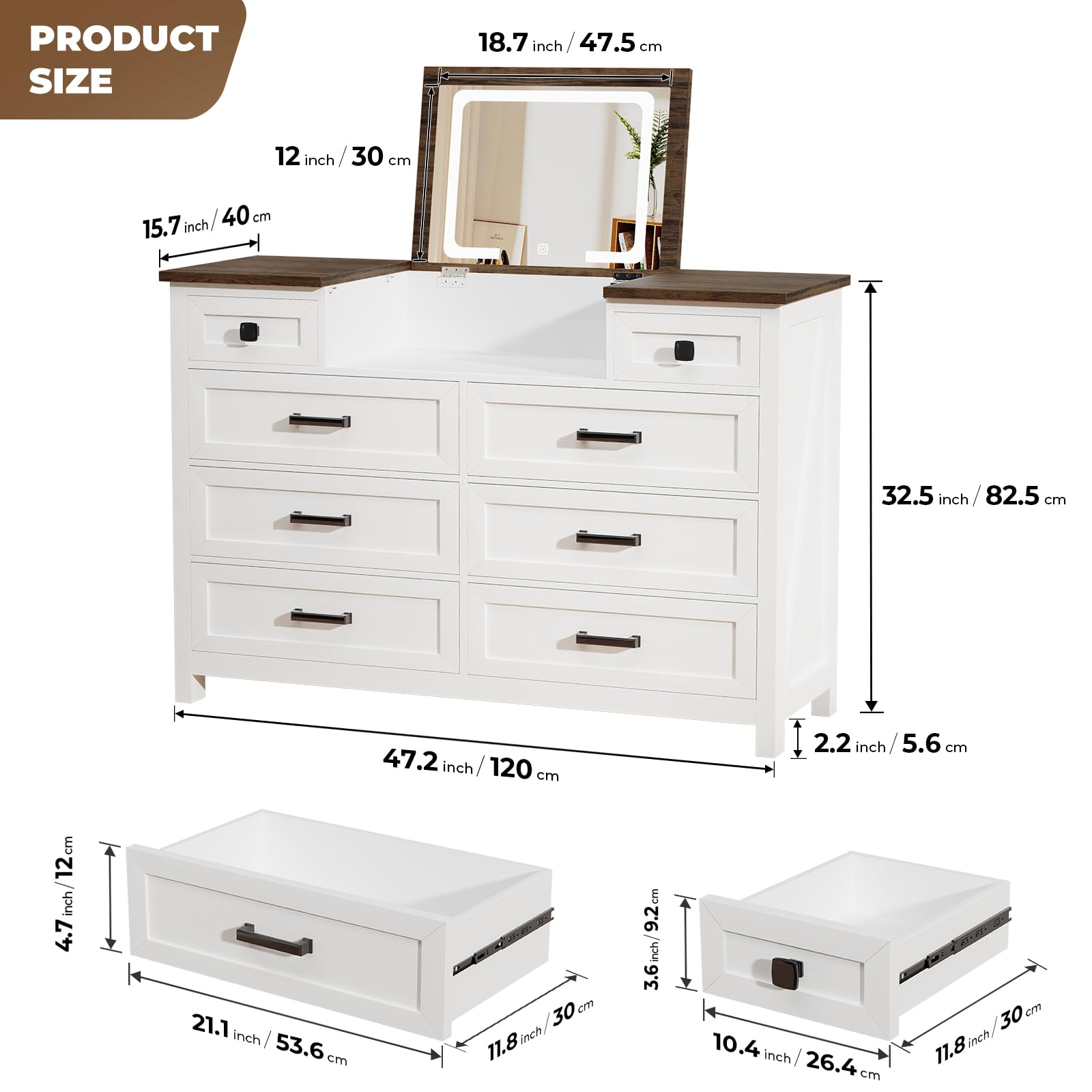 BROTTAR Dresser with Mirror for Bedroom, Chest of Drawers with LED Mirror, 8 Drawer Dresser, White Dressers for Kids, Wood Dressers, Farmhouse Makeup Vanity with Storage for Bedroom