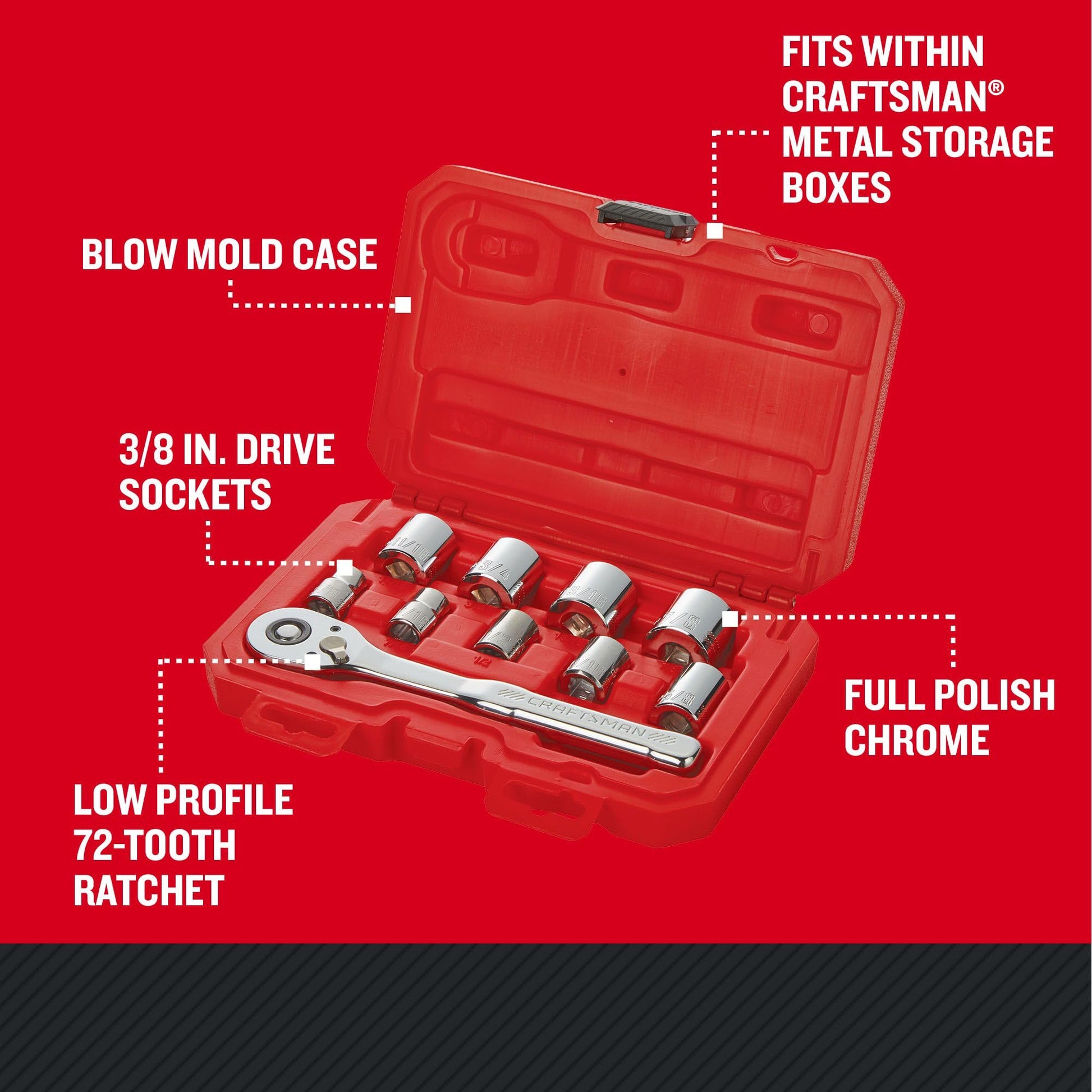 CRAFTSMAN Mechanics Tool Set with 72-tooth Low Profile Ratchet, SAE, 3/8 Inch Drive, 10 Piece (CMMT34563)