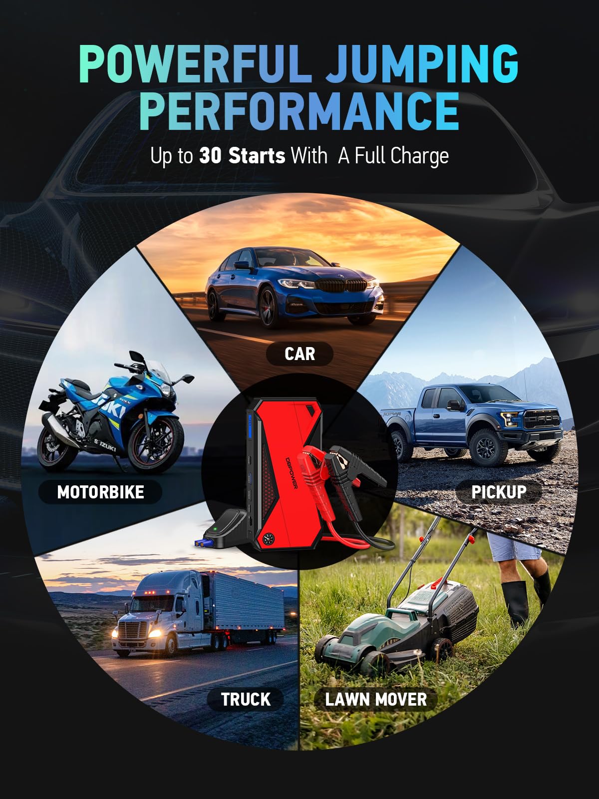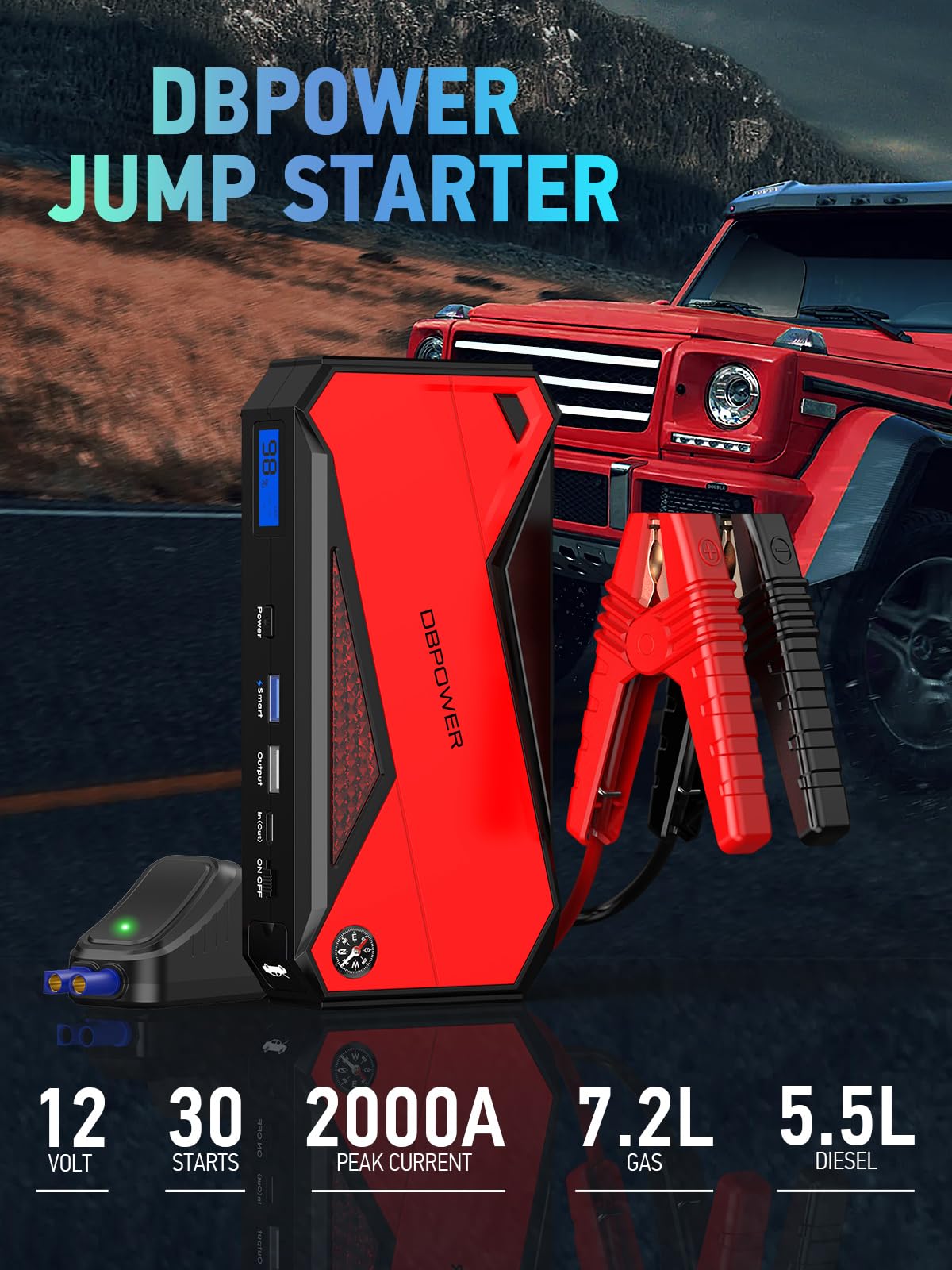 DBPOWER Peak 2000A 18000mAh Portable Car Jump Starter (up to 7.2L Gas, 5.5L Diesel Engine) Battery Booster with Smart Charging Port, Compass, LCD Screen and LED Light (Black/Red)