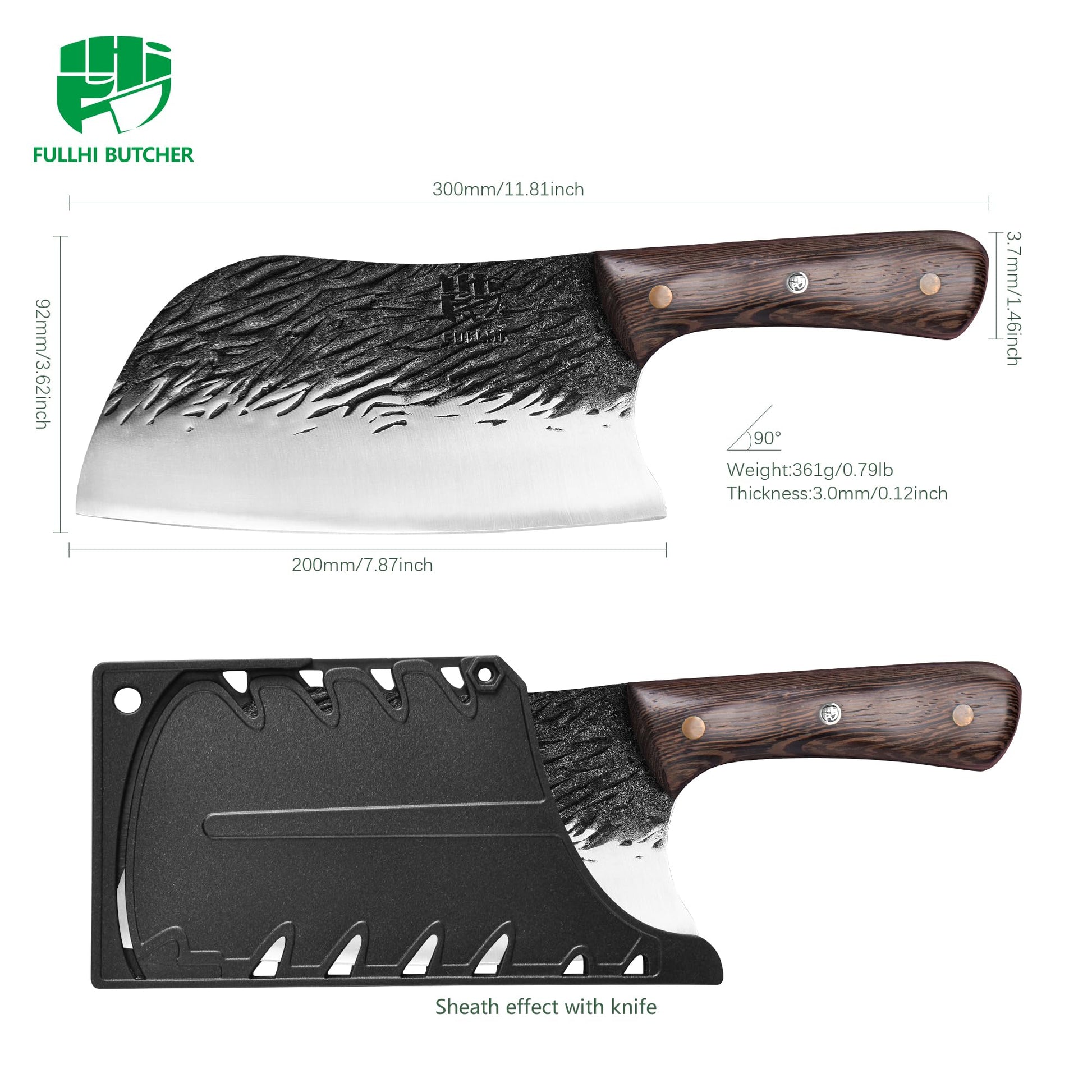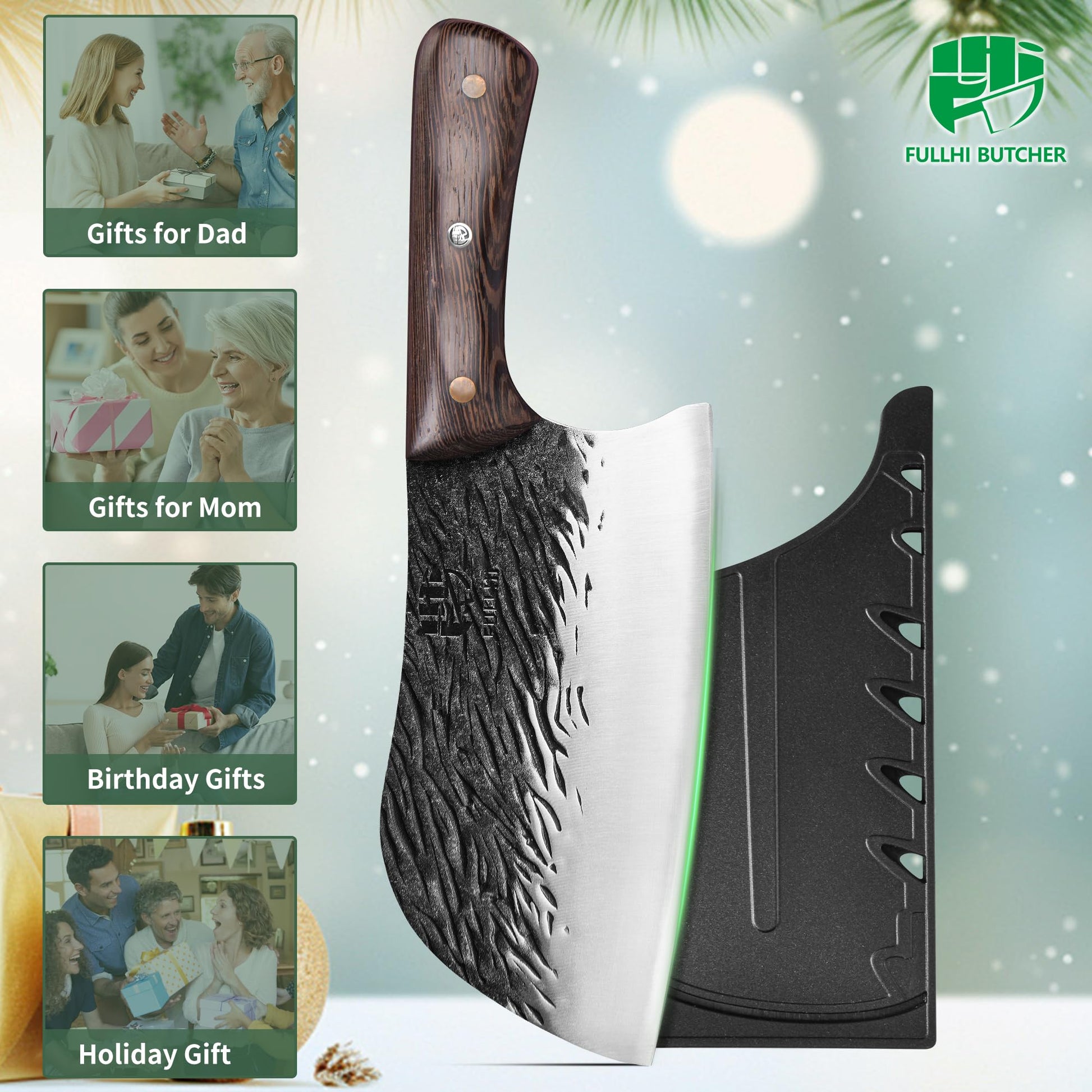 FULLHI Butcher Knife, Multi-color Wood Handle Full Tang Chef Knife with Sheath, High Carbon Steel Meat Slicing Kitchen Knife for Outdoor, Camping BBQ (Brown, Serbian Chef Knife)