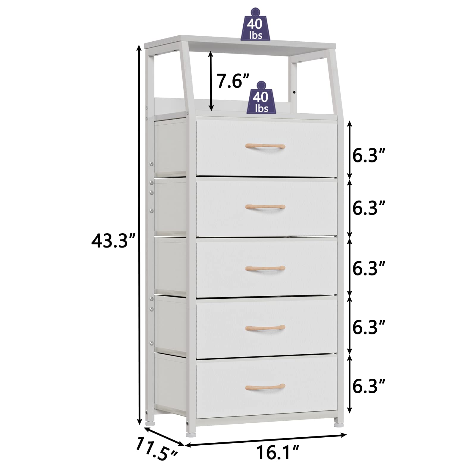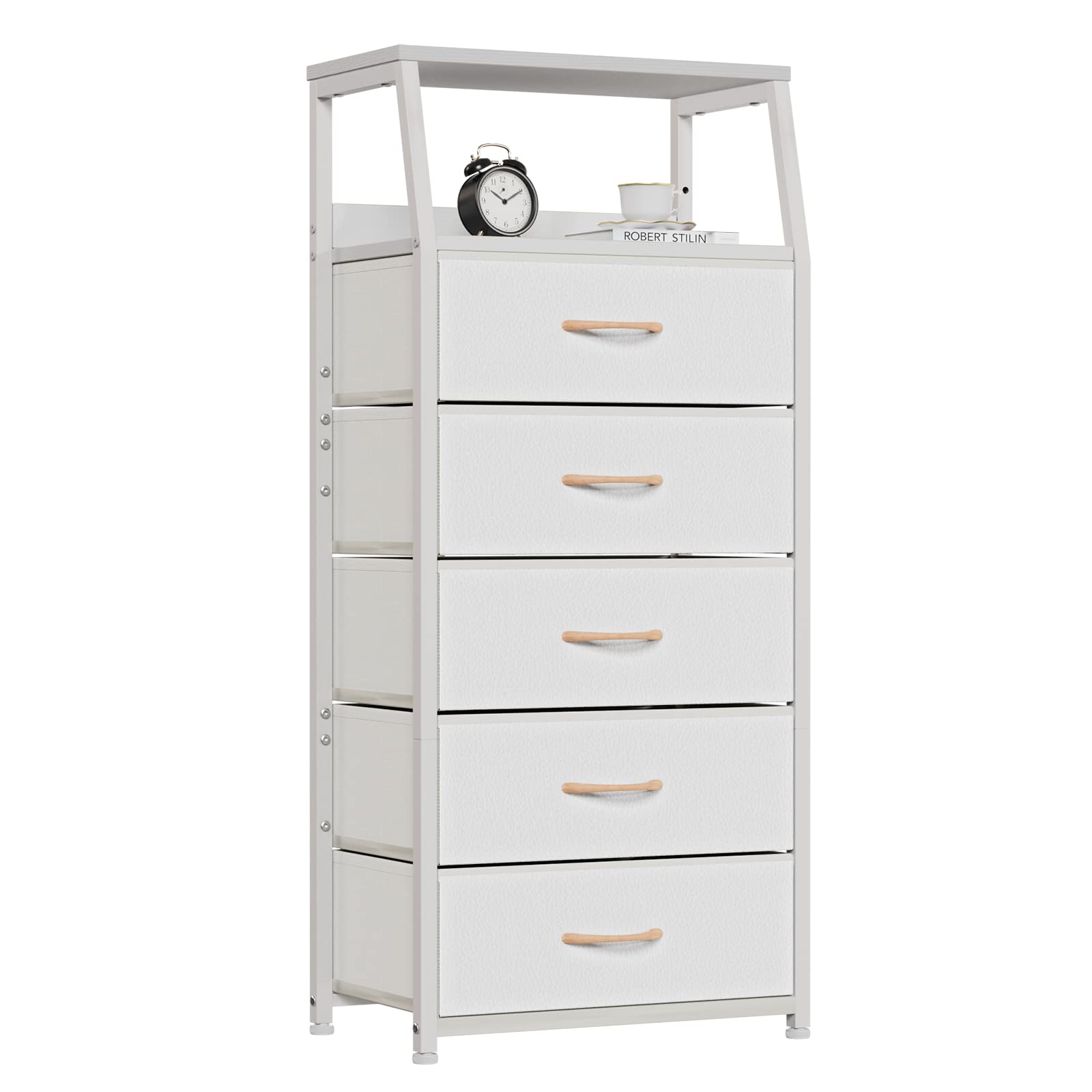 Furnulem White Dresser with 5 Drawers, Vertical Storage Tower Fabric Dresser for Bedroom, Hallway, Entryway, Nursery, Closet Organizer, Nightstand Bedside Table Furniture, Sturdy Steel Frame, Wood Top