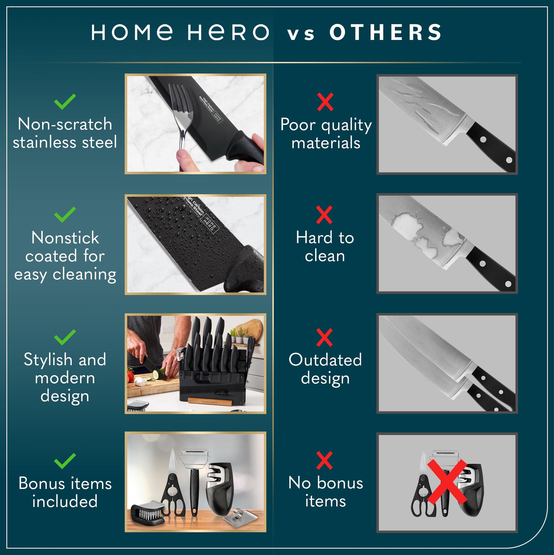 Home Hero Kitchen Knife Set with Sharpener - High Carbon Stainless Steel Knife Block Set with Ergonomic Handles (20 Pcs - Acrylic Black)