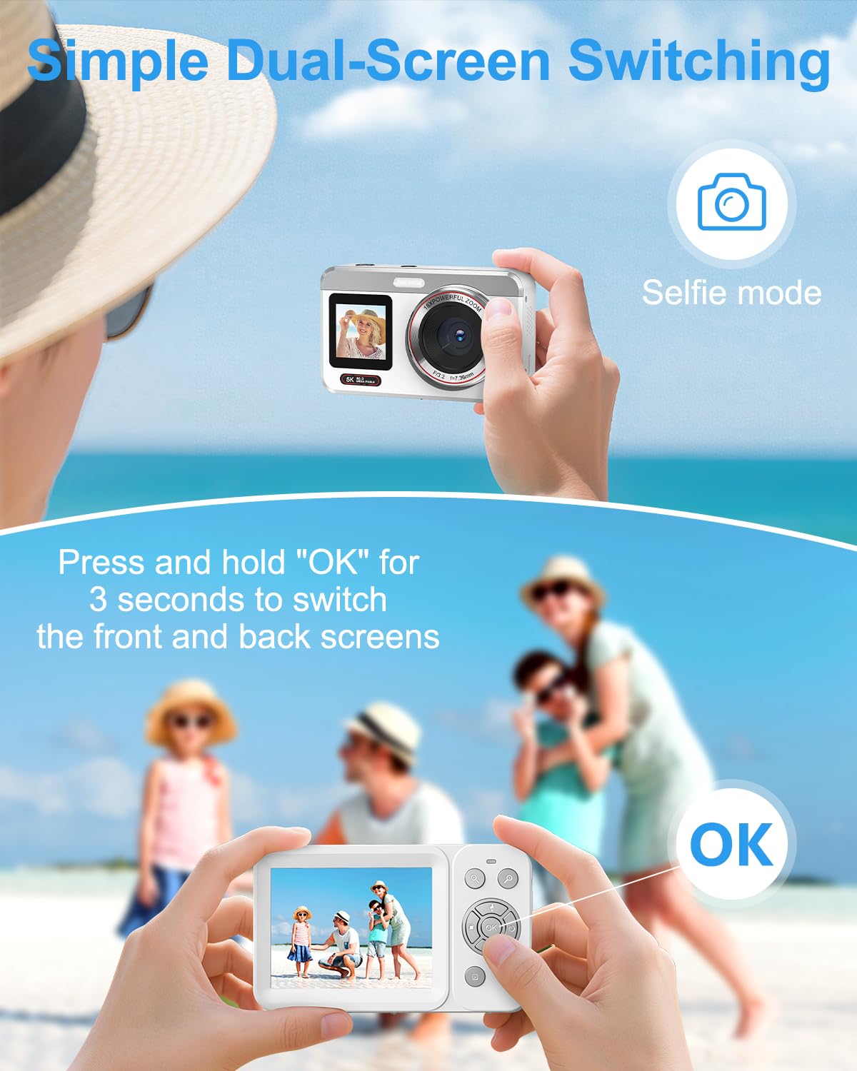 Hoorola 5K Digital Camera, 80MP Dual Screen Autofocus Vlogging Camera, 18X Zoom Point and Shoot Camera for Photography, Flash, 32GB Card, 2 Batteries, Compact Camera for Teens Adults (White)